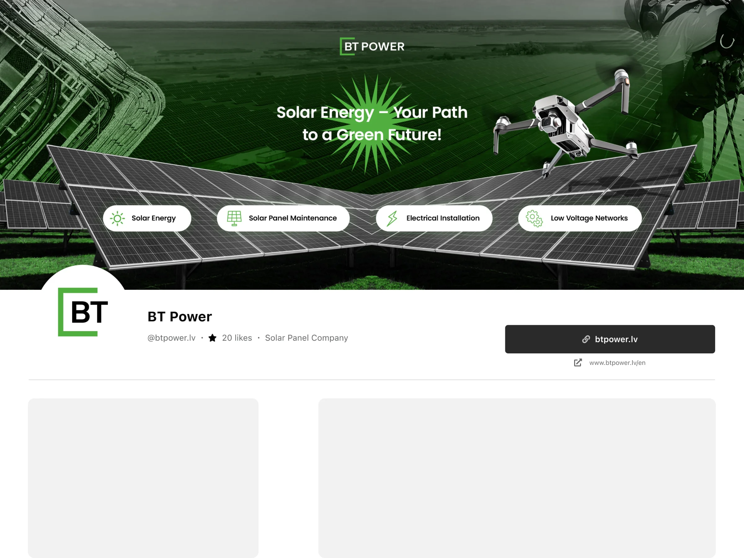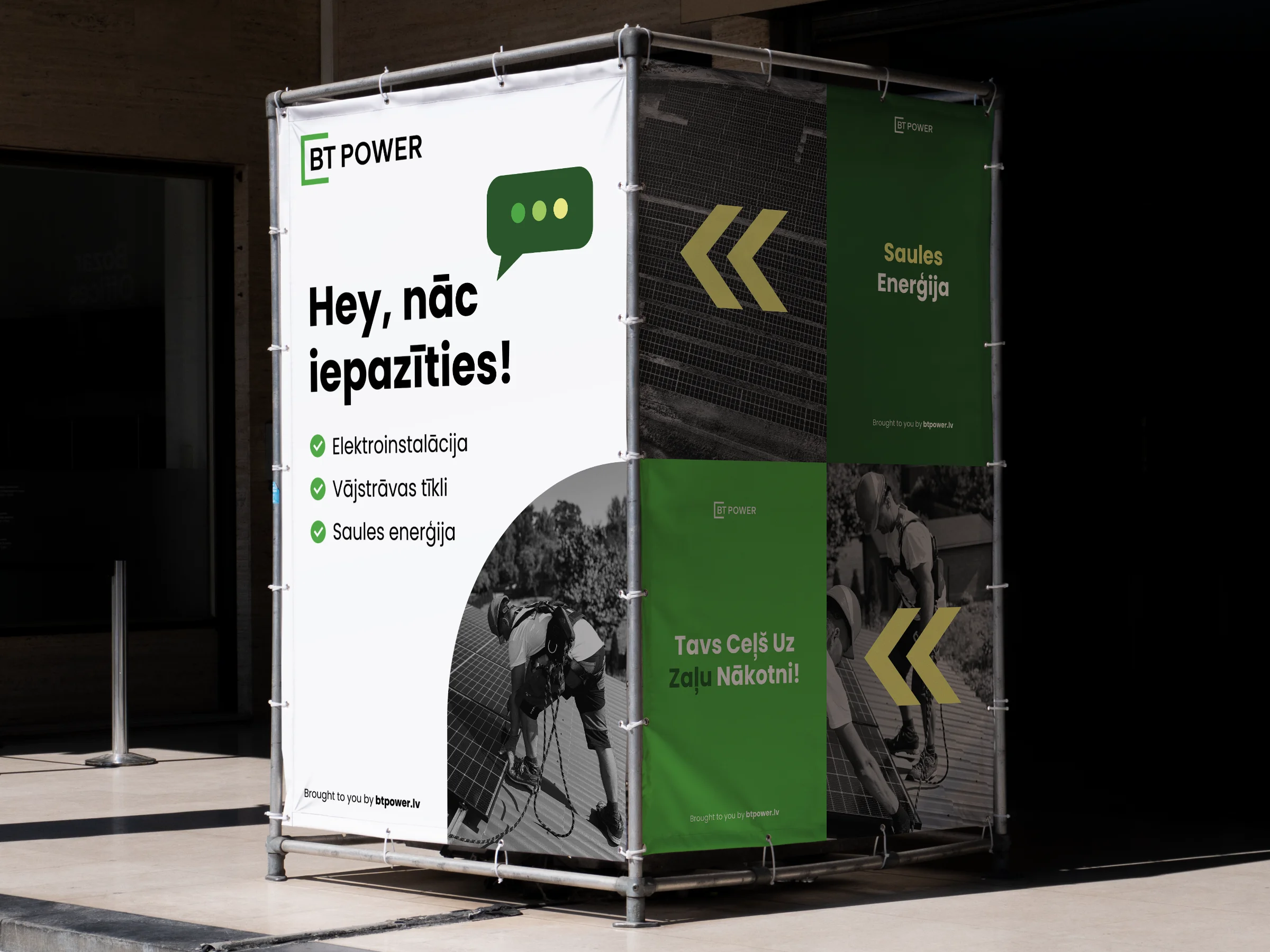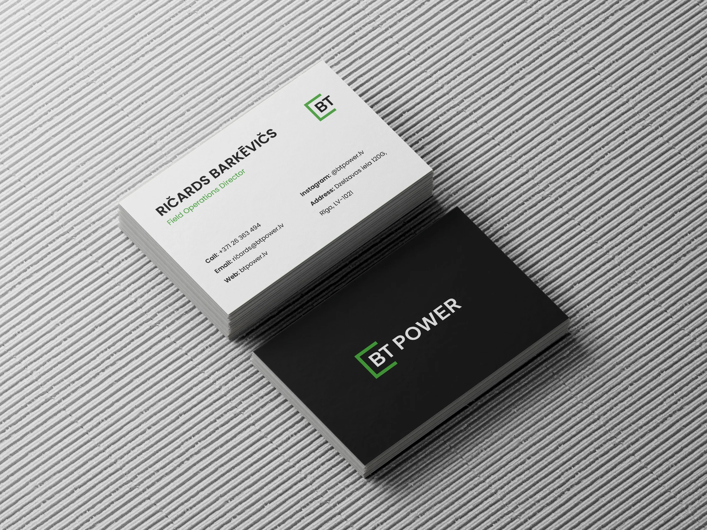 I refined and vectorised the existing BT Power logo to make it fully functional and scalable, preserving familiarity while improving clarity and usability. A simple, structured visual system was introduced, supported by a modern typeface that works reliably in both Latvian and English, and a restrained colour palette that balances professionalism with recognisability — including a green accent referencing renewable energy.