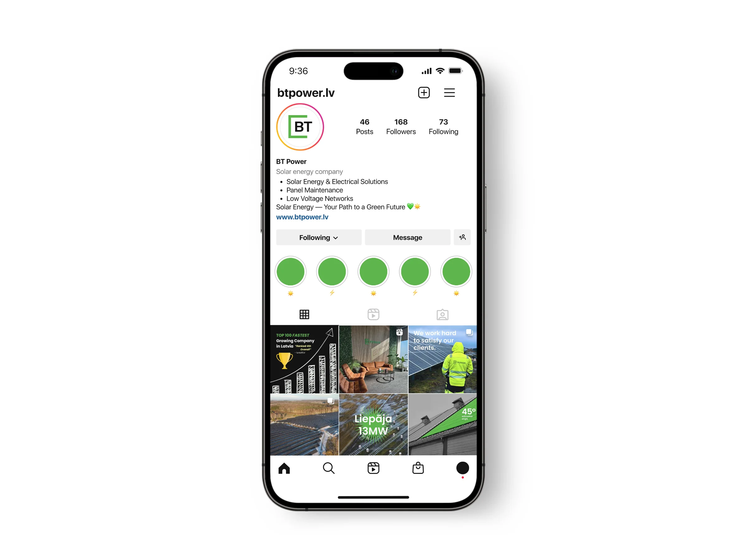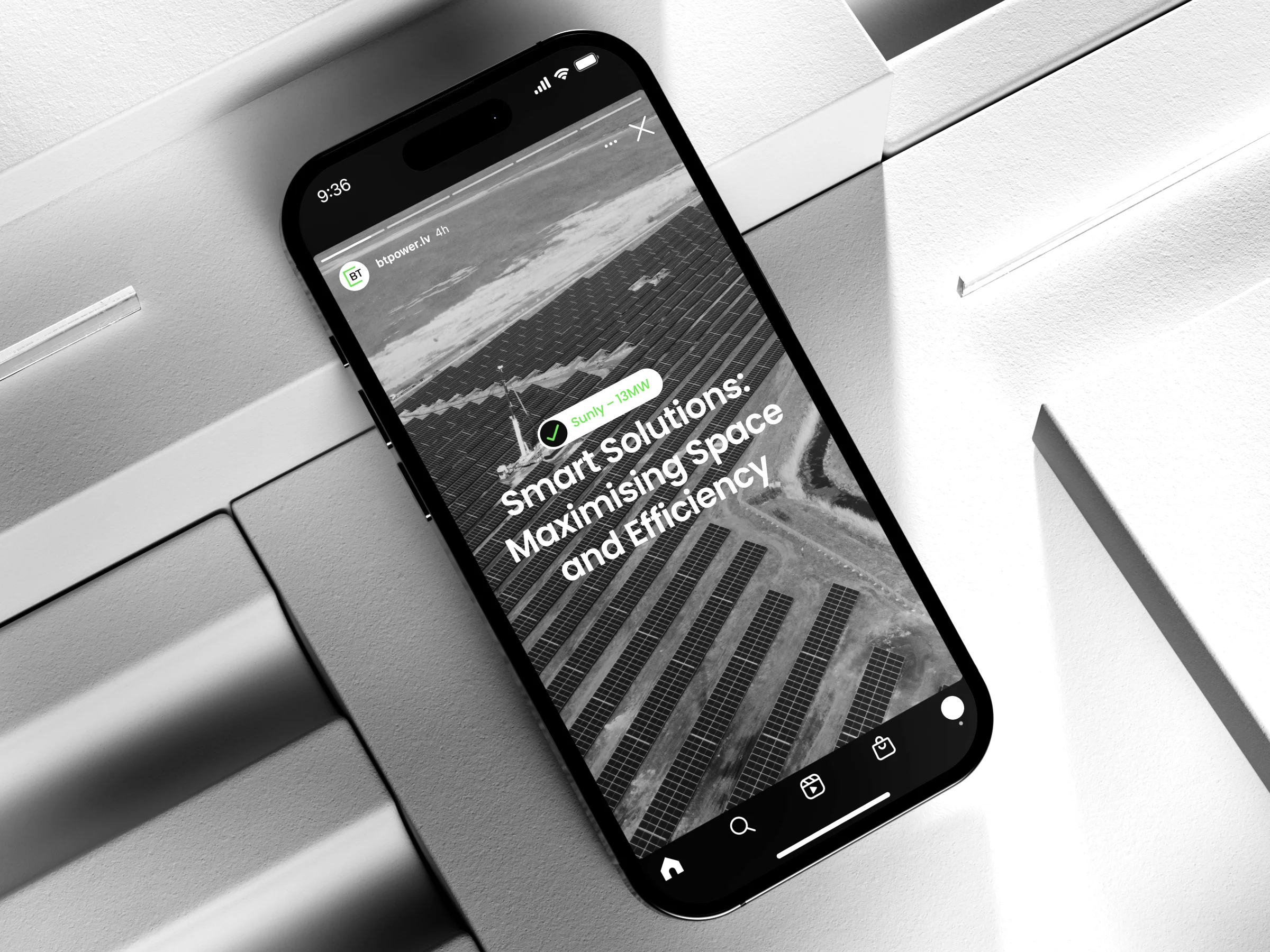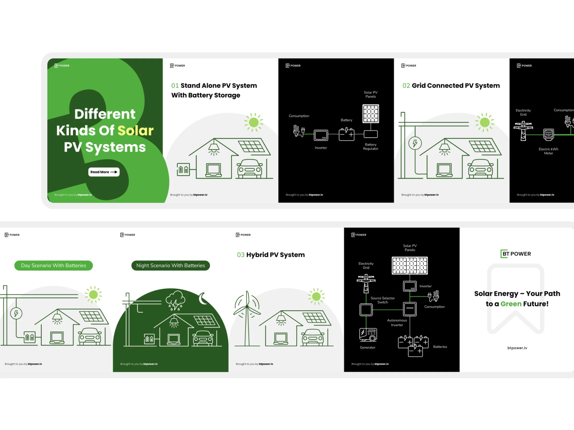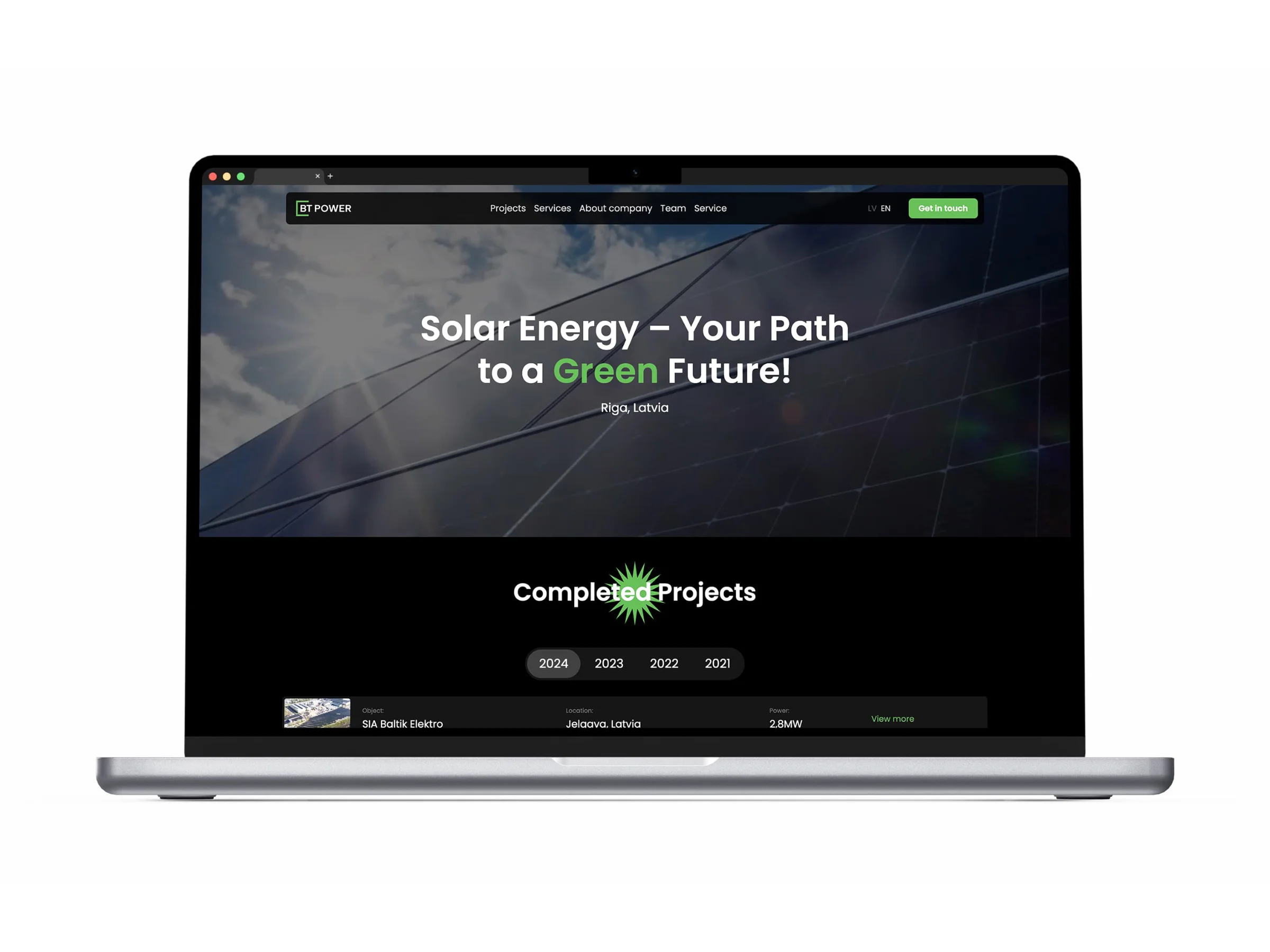 I refined and vectorised the existing BT Power logo to make it fully functional and scalable, preserving familiarity while improving clarity and usability. A simple, structured visual system was introduced, supported by a modern typeface that works reliably in both Latvian and English, and a restrained colour palette that balances professionalism with recognisability — including a green accent referencing renewable energy.