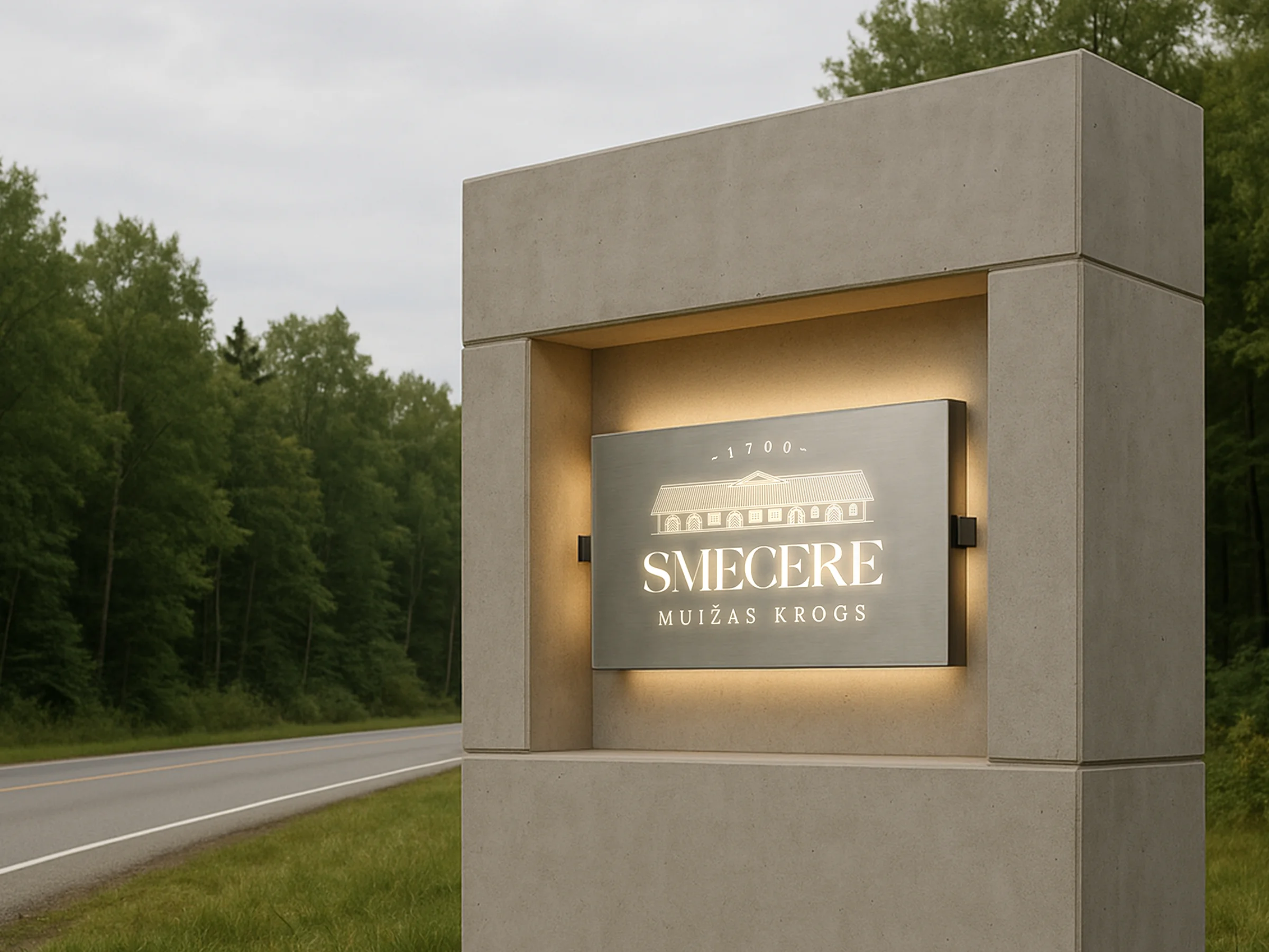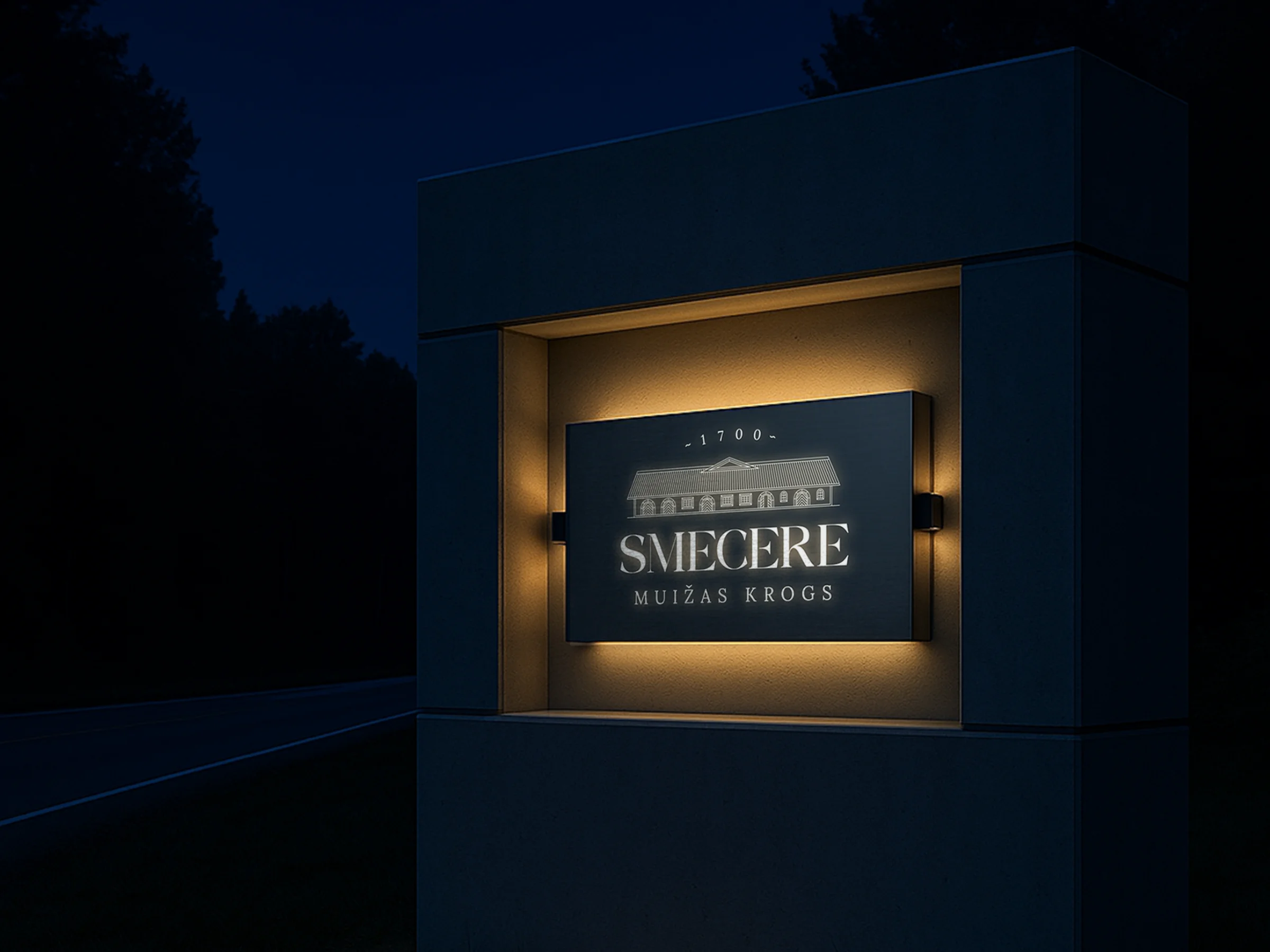 • “MUIŽAS KROGS” (Manor Tavern) in a classical serif for contrast and heritage