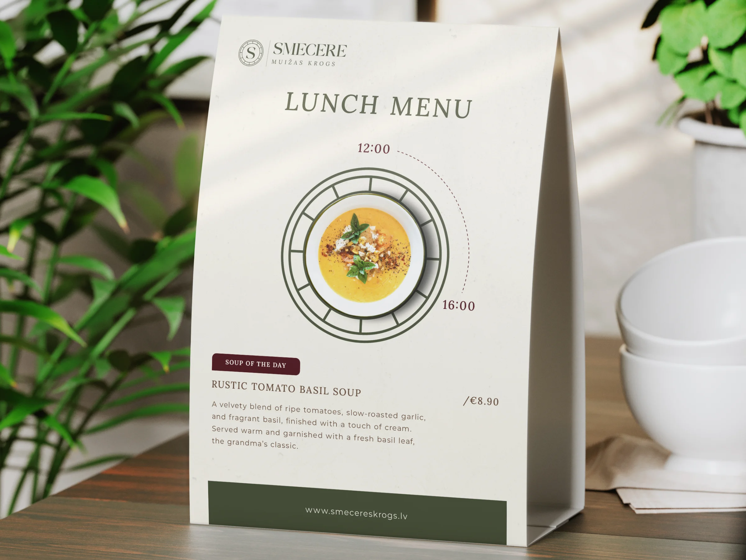 The manor’s daily lunch offers were available only during lunchtime. This concept was reflected in my creative use of the logomark as a clock. I overlaid the type of dish on offer onto the logomark and added time annotations to show when the lunch was available.